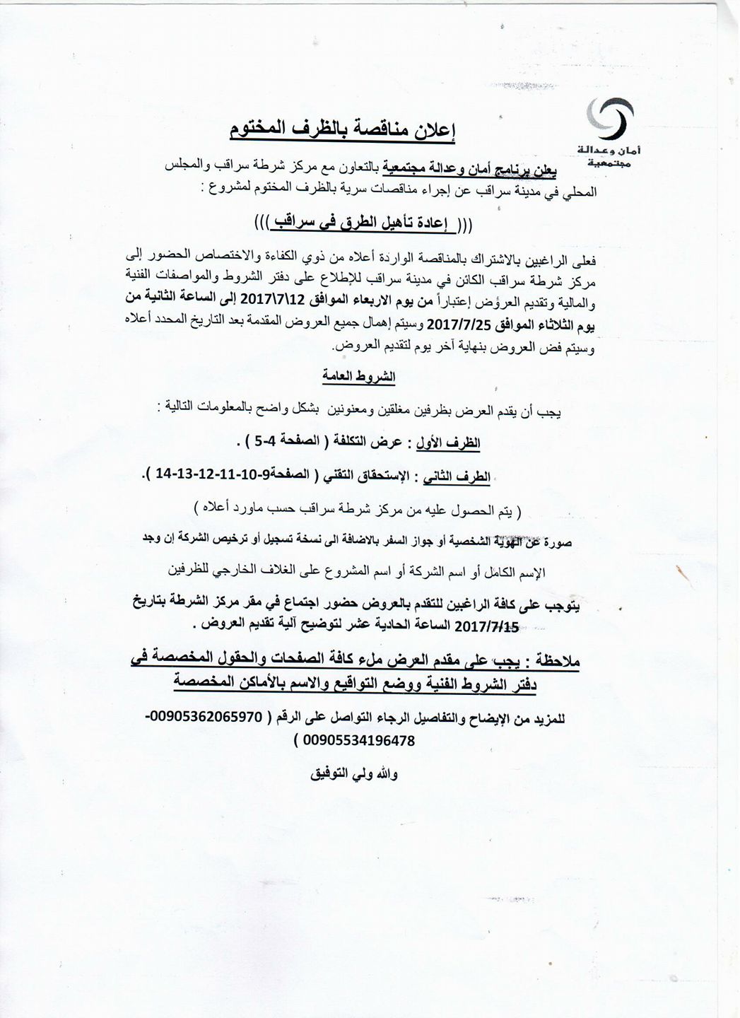 إعلان من برنامج أمان وعدالة مجتمعية عن مناقصة لإعادة تأهيل الطرق في سراقب