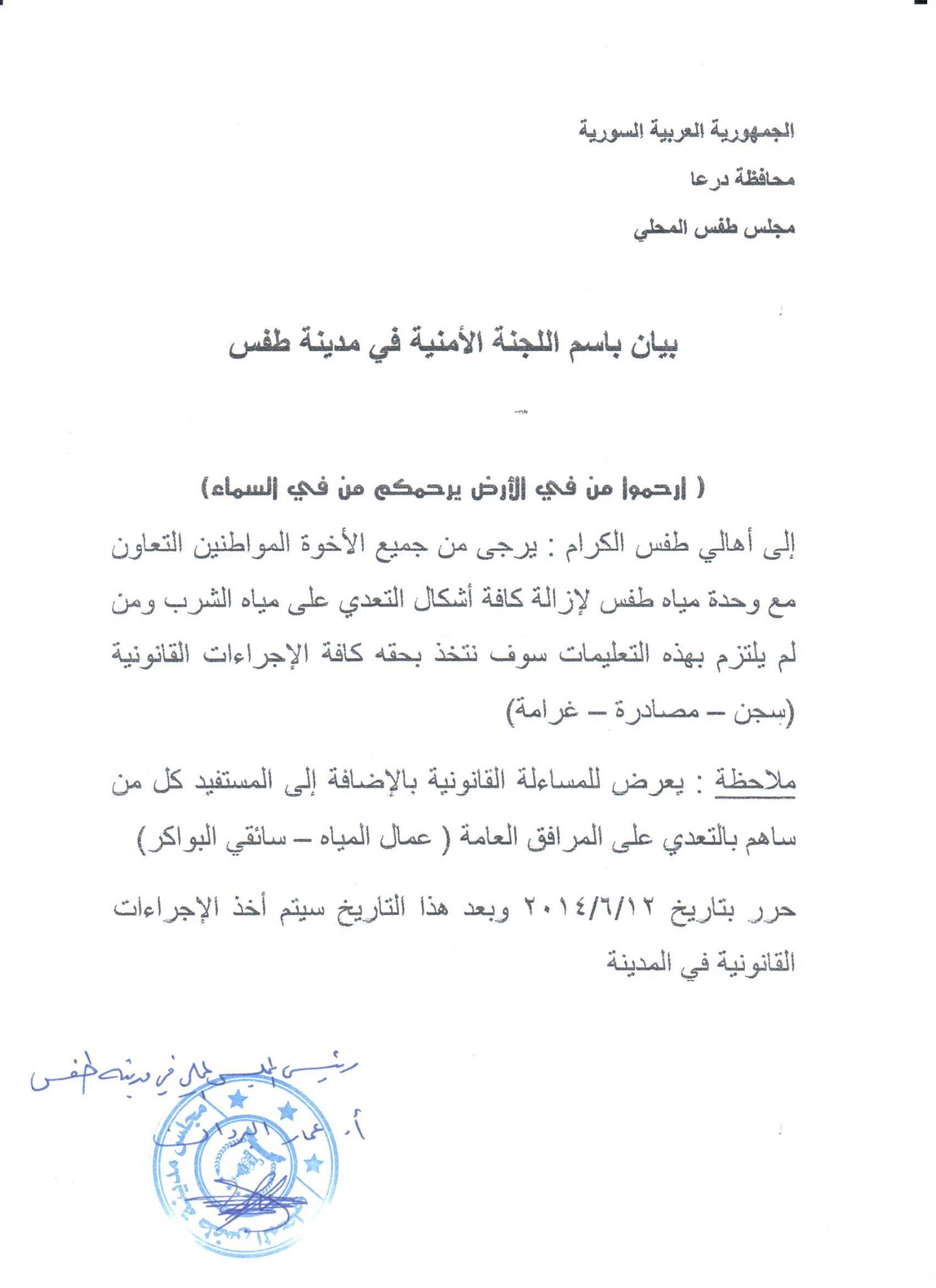 بيان من المجلس المحلي في مدينة طفس يدعو فيه المواطنين لإزالة كافة أشكال التعدي على شبكة المياه