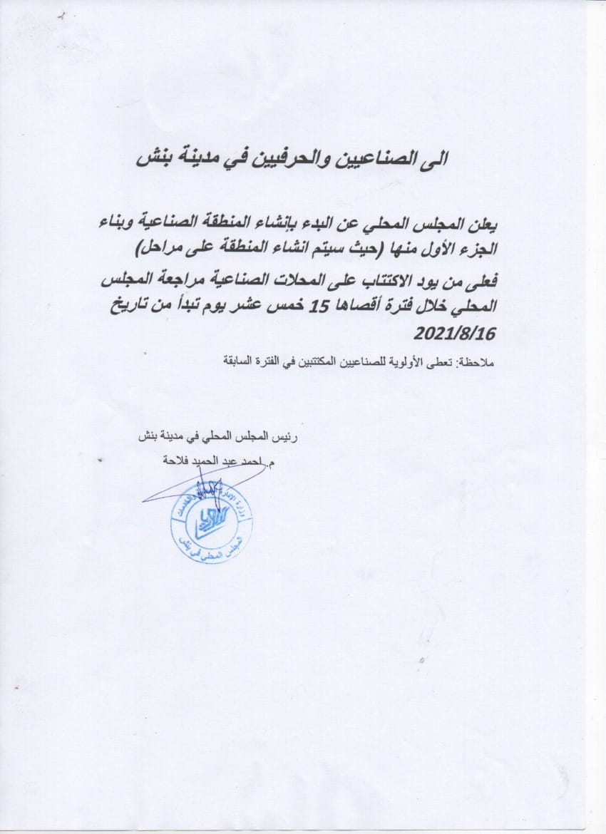 إعلان من المجلس المحلي في مدينة بنش حول البدء بإنشاء المنطقة الصناعية وبناء الجزء الأول منها