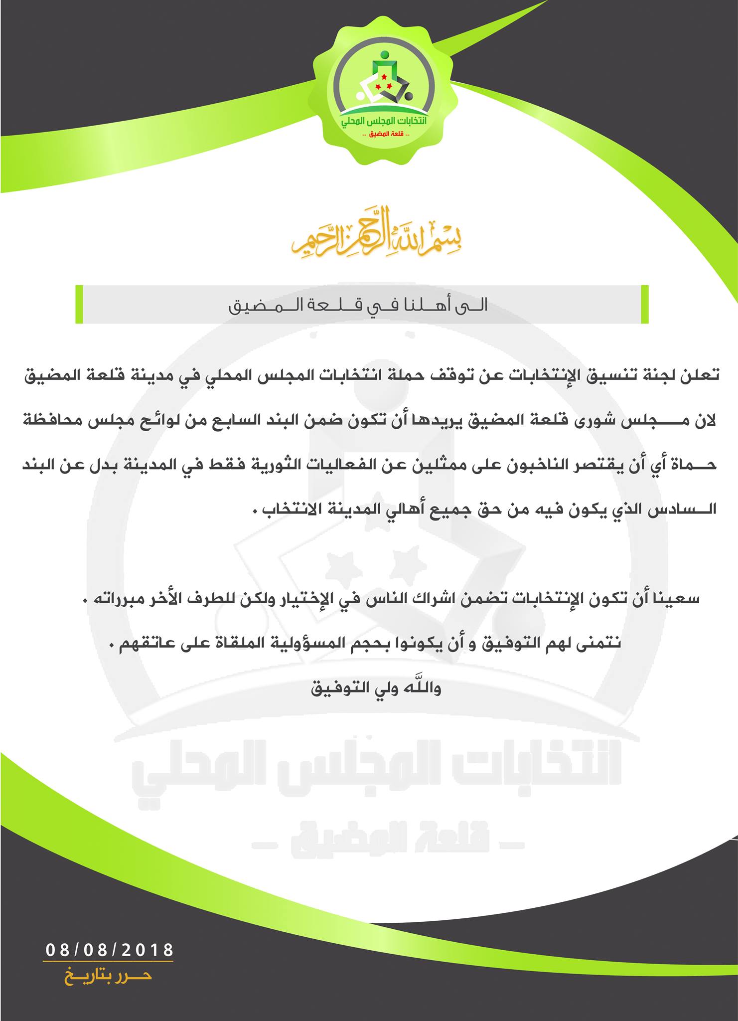بيان من لجنة تنسيق الإنتخابات في المحرر حول إيقاف حملة انتخابات انتخابات المجلس المحلي في قلعة المضيق