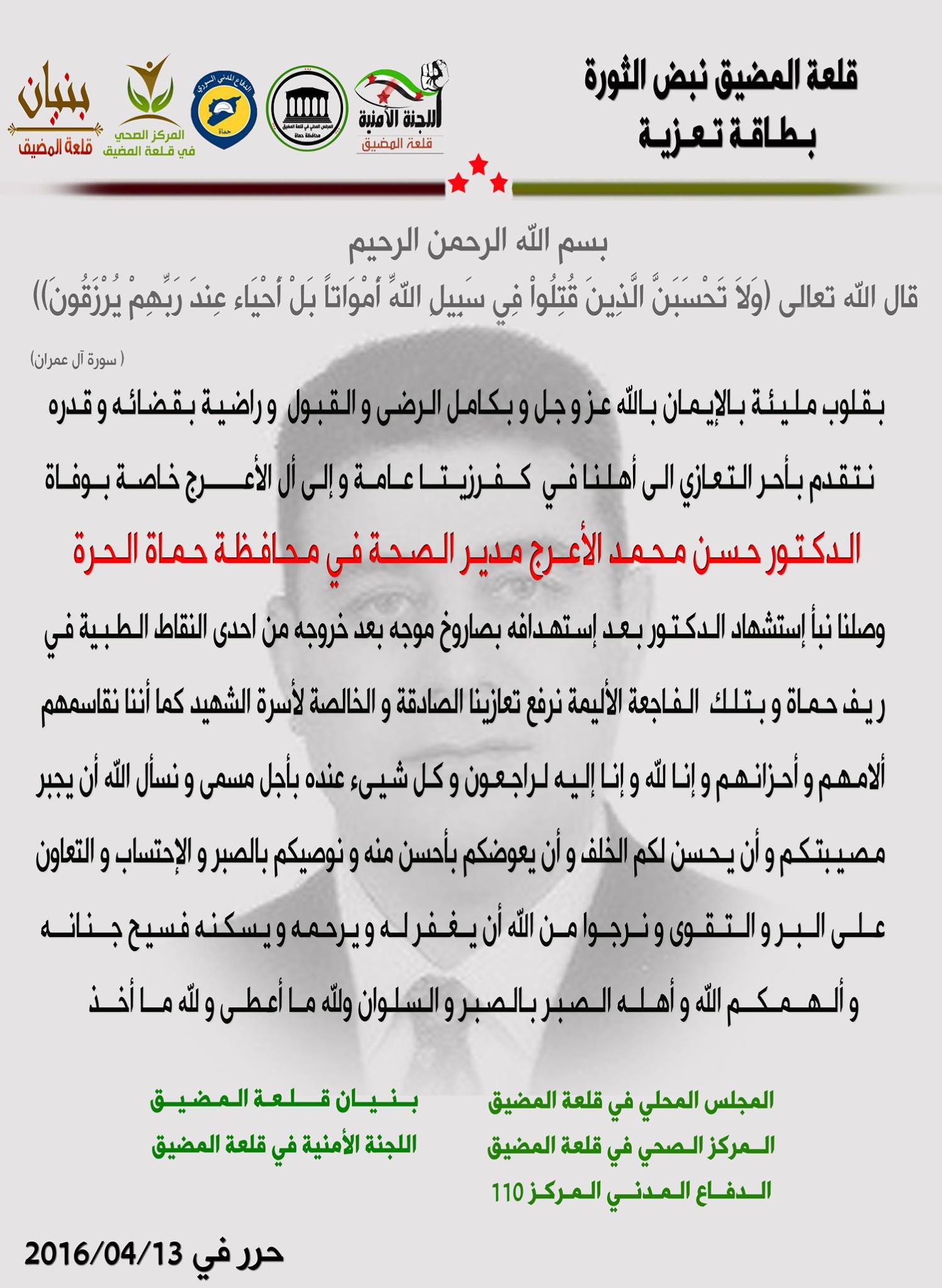 بيان تعزية من المجلس المحلي في قلعة المضيق بالدكتور حسن محمد الأعرج