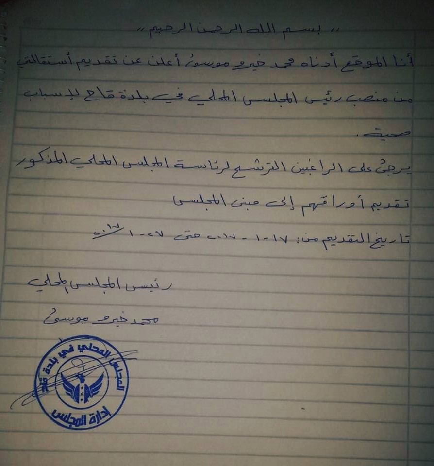 بيان استقالة محمد خيرو الموسى من رئاسة المجلس المحلي في بلدة قاح