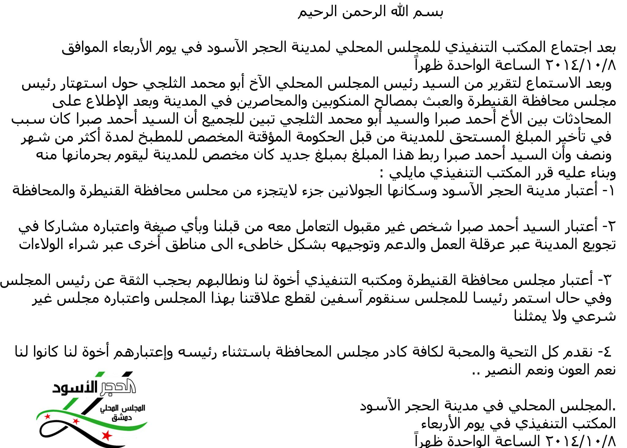 بعد اجتماع المكتب التنفيذي للمجلس المحلي لمدينة الحجر الآسود في يوم الأربعاء الموافق 8/10/2014 الساعة الواحدة ظهراً