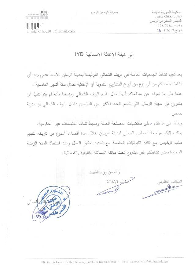 بيان من المجلس المحلي في مدينة الرستن حول تغيب هيئة الإغاثة الإنسانية IYD عن تنفيذ مشاريعها في الريف الشمالي