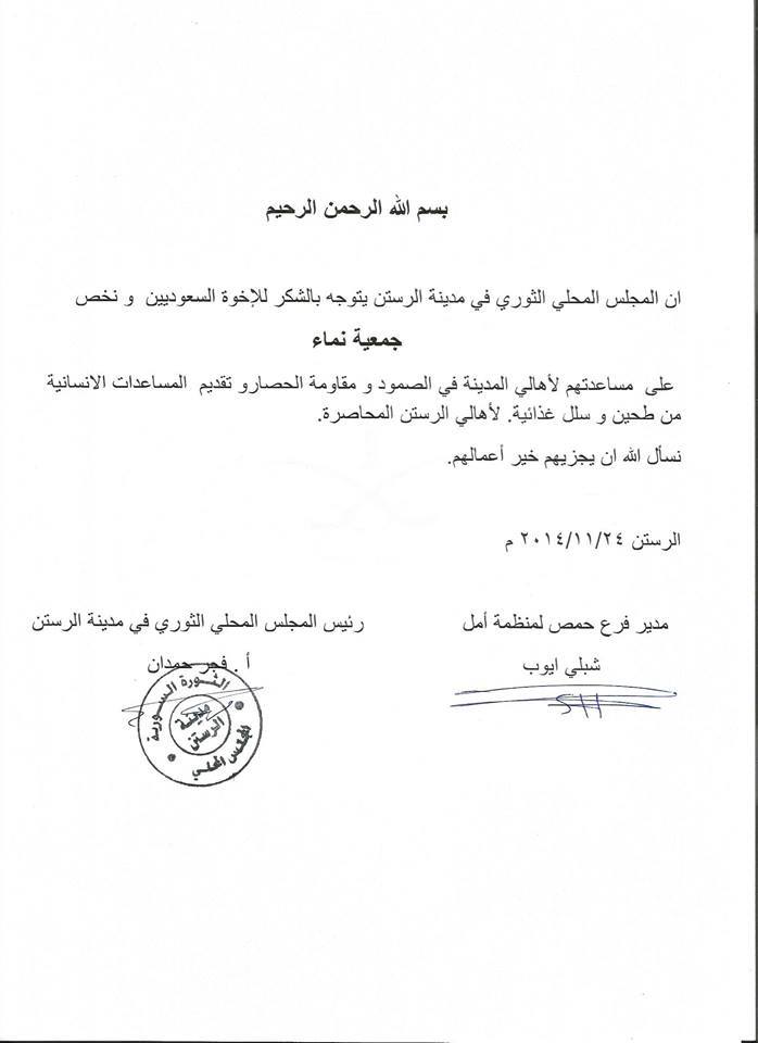 بيان شكر من المجلس المحلي في مدينة الرستن لجمعية نماء على تقديمهم المساعدات الإنسانية لأهالي المدينة