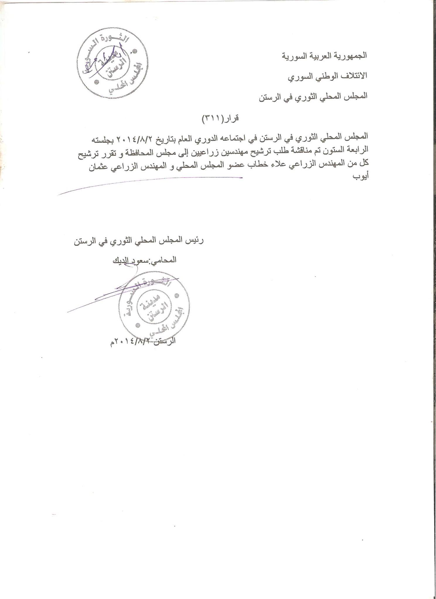 قرار من المجلس المحلي الثوري في مدينة الرستن حول مناقشة ترشيح مهندسين زراعيين لمجلس المحافظة