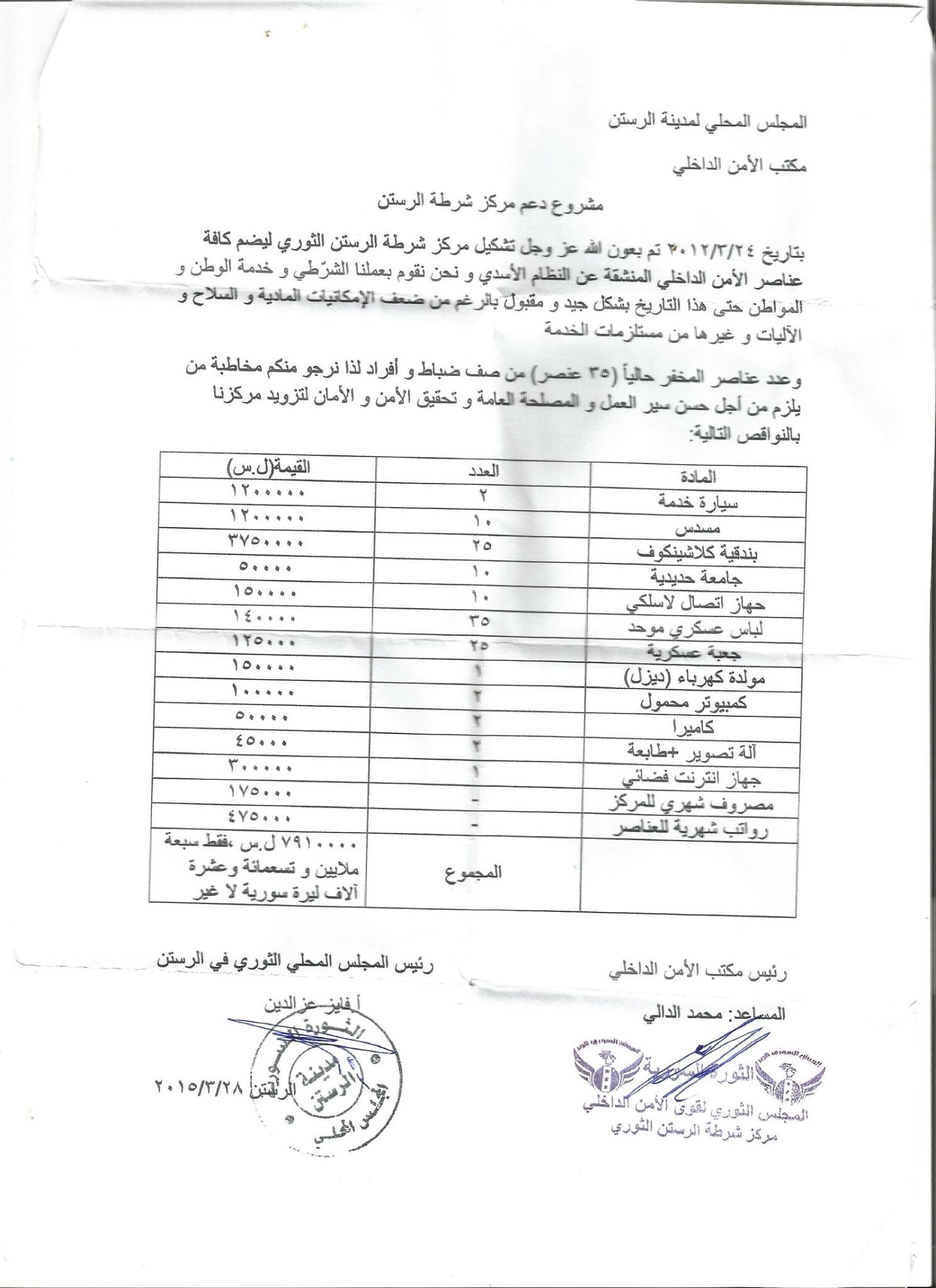 تعميم من المجلس المحلي لمدينة الرستن حول مشروع دعم مركز شرطة الرستن