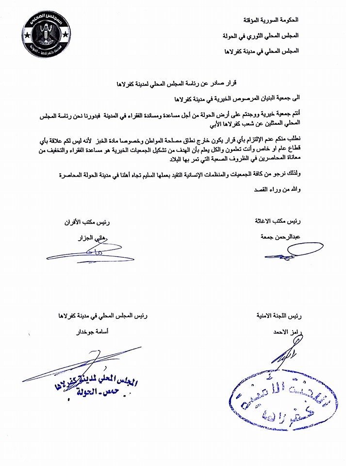 بيان من المجلس المحلي في مدينة كفرلاها إلى جمعية البيان المرصوص وغيرها من المنظمات بشأن التقيد بعملها السليم تجاه أهالي المنطقة