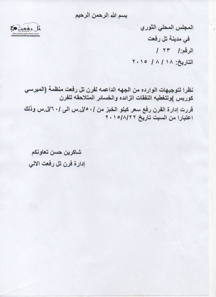 قرار من المجلس المحلي الثوري في مدينة تل رفعت حول رفع سعر كيلو الخبز