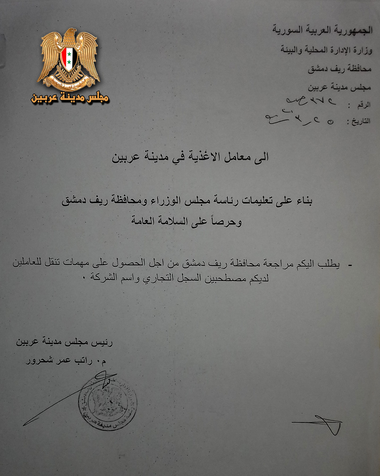 تعميم من مجلس مدينة عربين إلى معامل الأغذية في مدينة عربين يطلب منهم مراجعة محافظة ريف دمشق من أجل الحصول على مهمات نقل العاملين لديكم مصطحبين السجل التجاري واسم الشركة