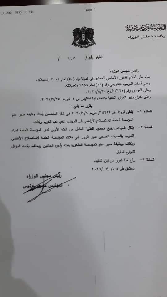 قرار من رئاسة الوزراء بتعيين ربيع محمود العلي مديرا للمؤسسة العامة لمياه الشرب والصرف الصحي بدير الزور