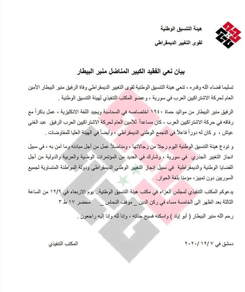 بيان نعي هيئة التنسيق الوطني بمنير البيطار