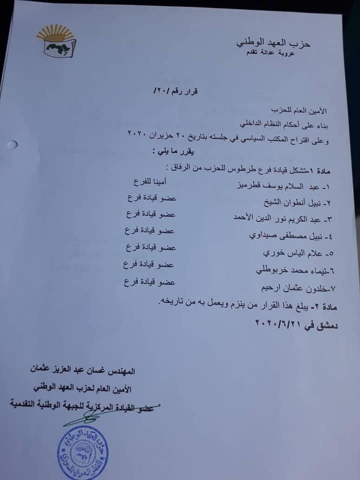 قرار من حزب العهد الوطني بشأن تشكيل قيادة فرع طرطوس