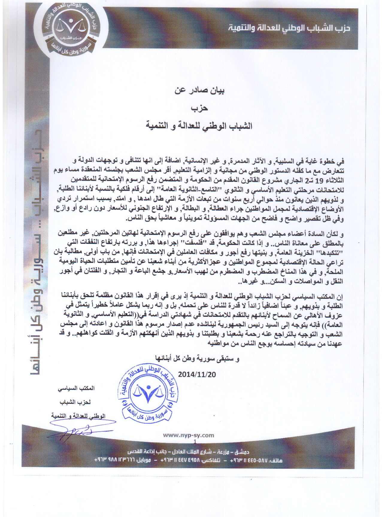 إن المكتب السياسي لحزب الشباب الوطني للعدالة و التنمية إذ يرى في إقرار هذا القانون مظلمة تلحق بأبنائنا الطلبة و بذويهم, و عبئاً اضافياً زائداً لا قدرة للناس على تحمله, بل و إنه ربما يشكل عاملاً خطيراً يتمثل في عزوف الأهالي عن السماح لأبنائهم بالتقدم للامتحانات في شهادتي الدراسة في((التعليم الأساسي, و الثانوية العامة)) فإنه يتوجه إلى السيد رئيس الجمهورية ليناشده عدم إصدار مرسوم هذا القانون و اعادته إلى مجلس الشعب و التوجيه بالتراجع عنه رحمة بشعبنا و بطلبتنا و بذويهم الذين أنهكتهم الأزمة و اثقلت كواهلهم.. و قد عهدنا من سيادته إحساسه بوجع الناس من مواطنيه