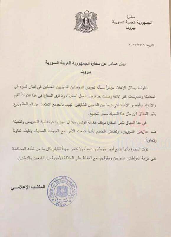 بيان من السفارة السورية في بيروت حول تعرض المواطنين السوريين لسوء المعاملة