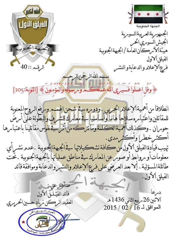 قرار من الفيلق الأول في الجبهة الحنوبية إلى كافة تشكيلاتها بعدم نشر أي روابط أو صور أو معلومات عن المعارك في مناطق جبهتها