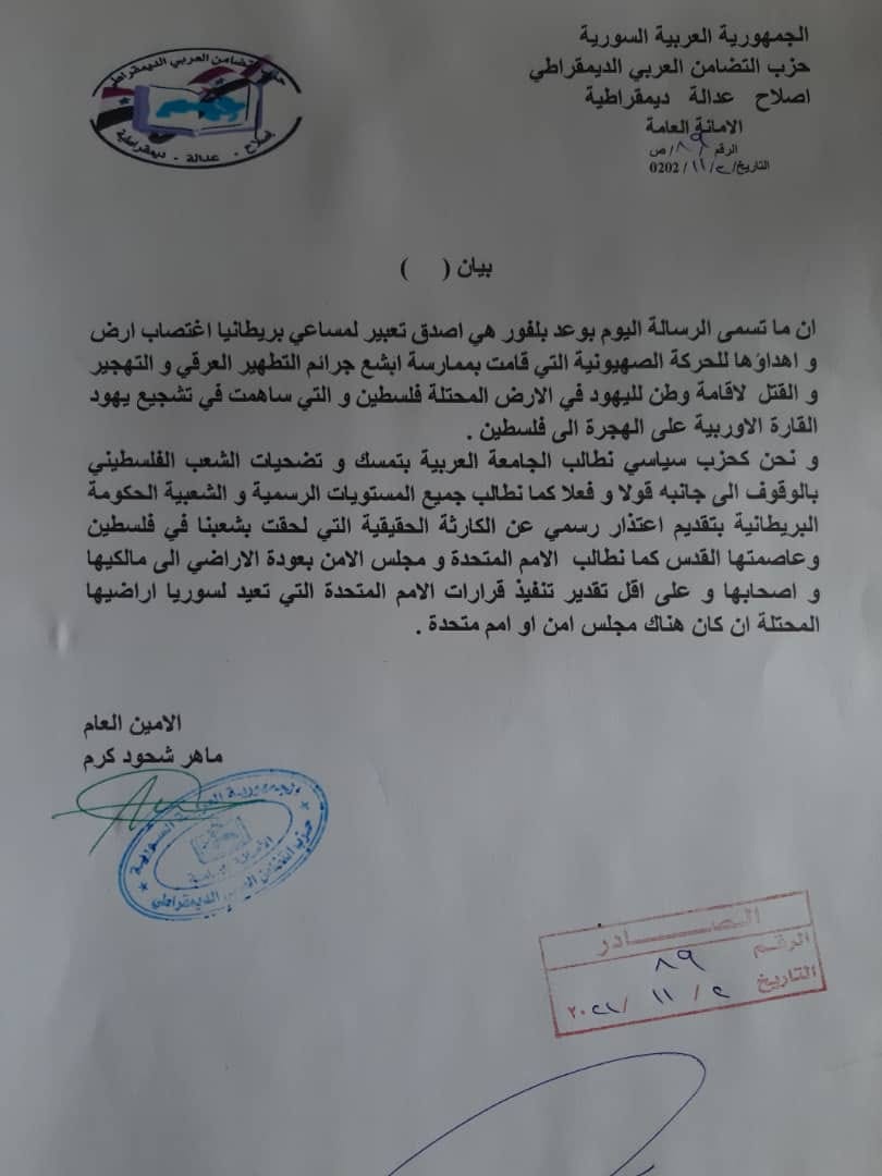 بيان حزب التضامن العربي الديمقراطي حول القضية الفلسطينية