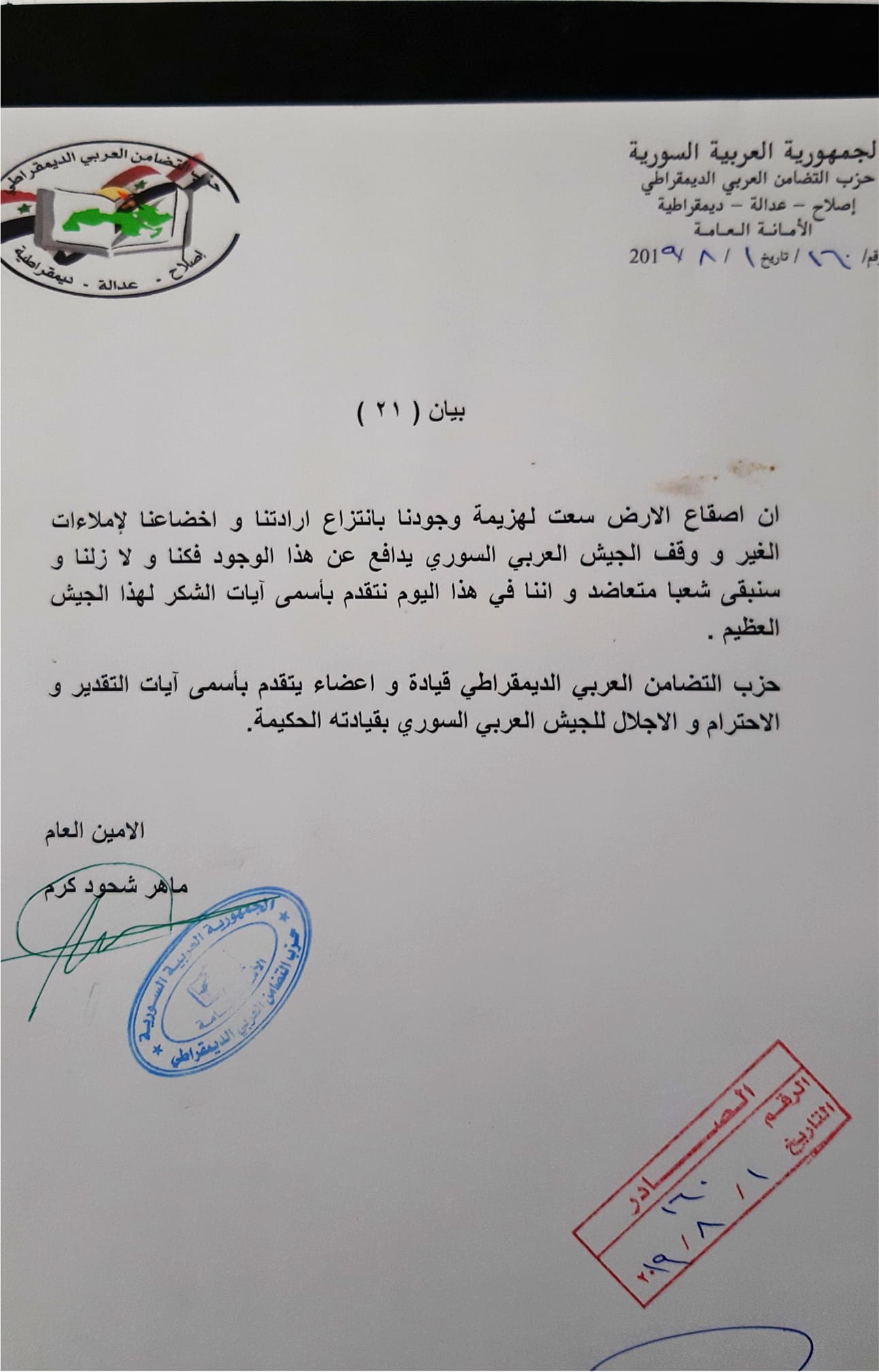 بيان من حزب التضامن العربي الديمقراطي بخصوص عيد الجيش