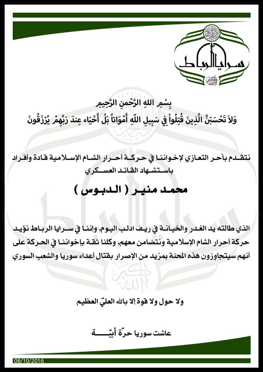 بيان من سرايا الرباط تعزي فيه حركة أحرار الشام بالقائد محمد منير (الدبوس) في ريف إدلب