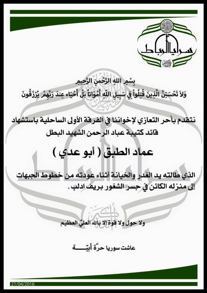 بيان من سرايا الرباط تعزي فيه الفرقة الأولى ساحلية بقائد كتيبة عباد الرحمن البطل عماد الطبق (أبوعدي)