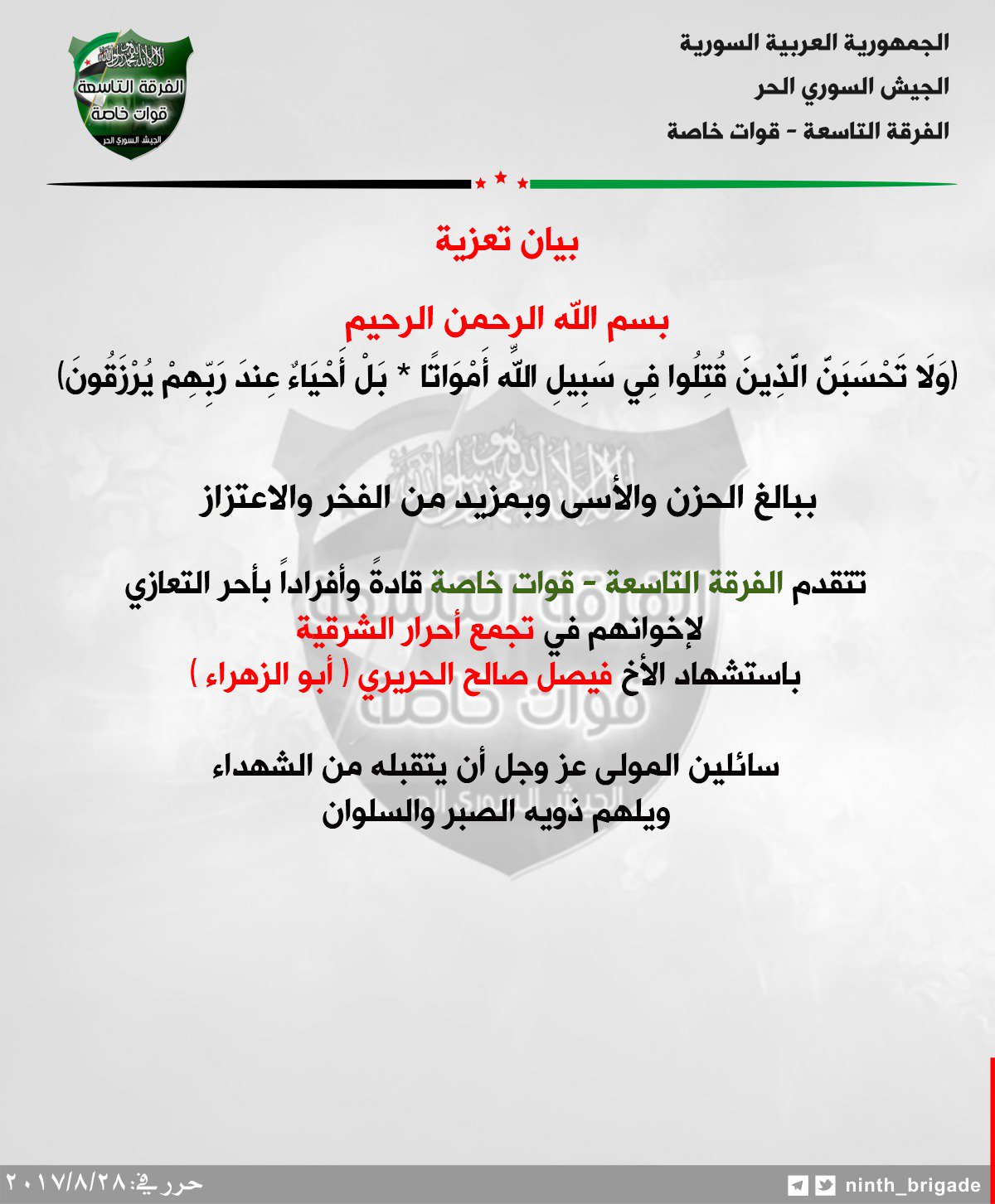 بيان من الفرقة التاسعة قوات خاصة تعزي فيه تجمع أحرار الشرقية بأحد قادته