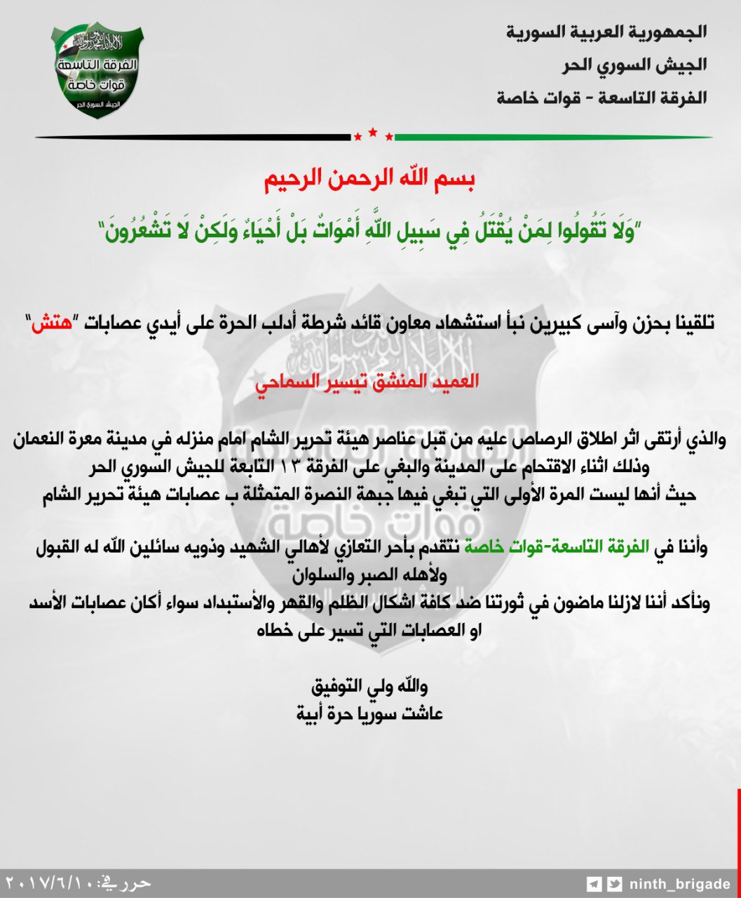 بيان من الفرقة التاسعة قوات خاصة تعزي فيه بمعاون قائد شرطة إدلب العميد تيسير السماحي على أيدي عناصر هيئة تحرير الشام