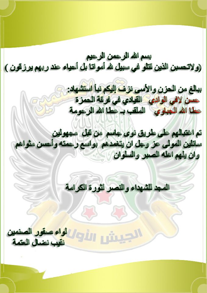 بيان من لواء صقور الصنمين ينعي فيه قياديان في فرقة الحمزة