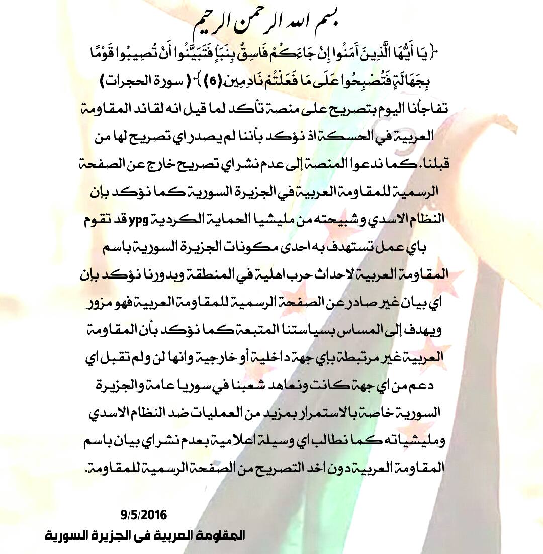 بسم الله الرحمن الرحيم ﴿ يَا أَيُّهَا الَّذِينَ آَمَنُوا إِنْ جَاءَكُمْ فَاسِقٌ بِنَبَأٍ فَتَبَيَّنُوا أَنْ تُصِيبُوا قَوْمًا بِجَهَالَةٍ فَتُصْبِحُوا عَلَى مَا فَعَلْتُمْ نَادِمِينَ (6) ﴾ ( سورة الحجرات) تفاجأنا اليوم بتصريح على منصة تأكد لما قيل انه لقائد المقاومة العربية في الحسكة اذ نؤكد بأننا لم يصدر اي تصريح لها من قبلنا. كما ندعوا المنصة إلى عدم نشر اي تصريح خارج عن الصفحة الرسمية للمقاومة العربية في الجزيرة السورية كما نؤكد بإن النظام الاسدي وشبيحته من مليشيا الحماية الكردية ypg قد تقوم باي عمل تستهدف به احدى مكونات الجزيرة السورية باسم المقاومة العربية لاحداث حرب اهلية في المنطقة،وبأمكان الجميع الرجوع للصفحة ومشاهدة تاريخ اصدار البيان وتاريخ الأعلان عن العملية، وبدورنا نؤكد بإن اي بيان غير صادر عن الصفحة الرسمية للمقاومة العربية فهو مزور ويهدف إلى زرع الفتنة الأهلية في المنطقة كما نؤكد بأن المقاومة العربية غير مرتبطة بإي جهة داخلية أو خارجية وانها لن ولم تقبل اي دعم من اي جهة كانت ونعاهد شعبنا في سوريا عامة والجزيرة السورية خاصة بالاستمرار بمزيد من العمليات ضد النظام الاسدي ومليشياته كما نطالب اي وسيلة اعلامية بعدم نشر اي بيان باسم المقاومة العربية دون اخد التصريح من الصفحة الرسمية للمقاومة.