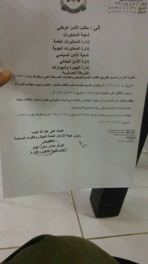 قرار من هيئة الأركان العامة للجيش والقوات المسلحة لدى النظام بعدم التعرض أو إيقاف العناصر العاملة مع الجانب الإيراني الحاملين لبطاقات تدل على ذلك
