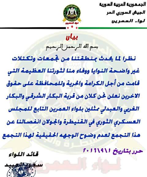 بيان من لواء العمرين يعلن فيه انفصاله عن المجلس العسكري في القنيطرة والجولان لعدم وجود وجهة واضحة للمجلس