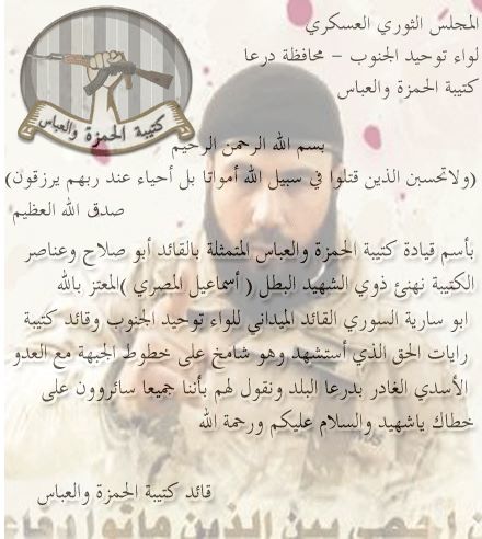 بيان من كتيبة الحمزة والعباس تعزي فيه لواء توحيد الجنوب بالقائد الميداني إسماعيل المصري