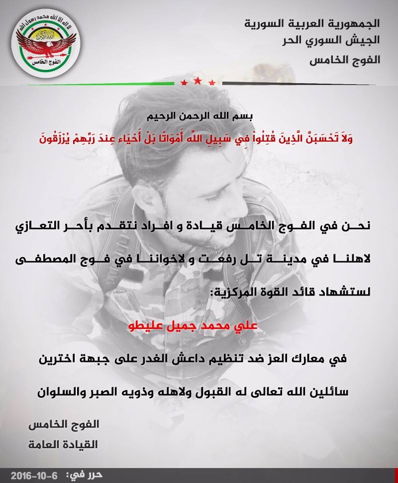 بيان من الفوج الخامس يعزي فيه فوج المصطفى وأهالي تل رفعت بعلي عليطو قائد القوة المركزية