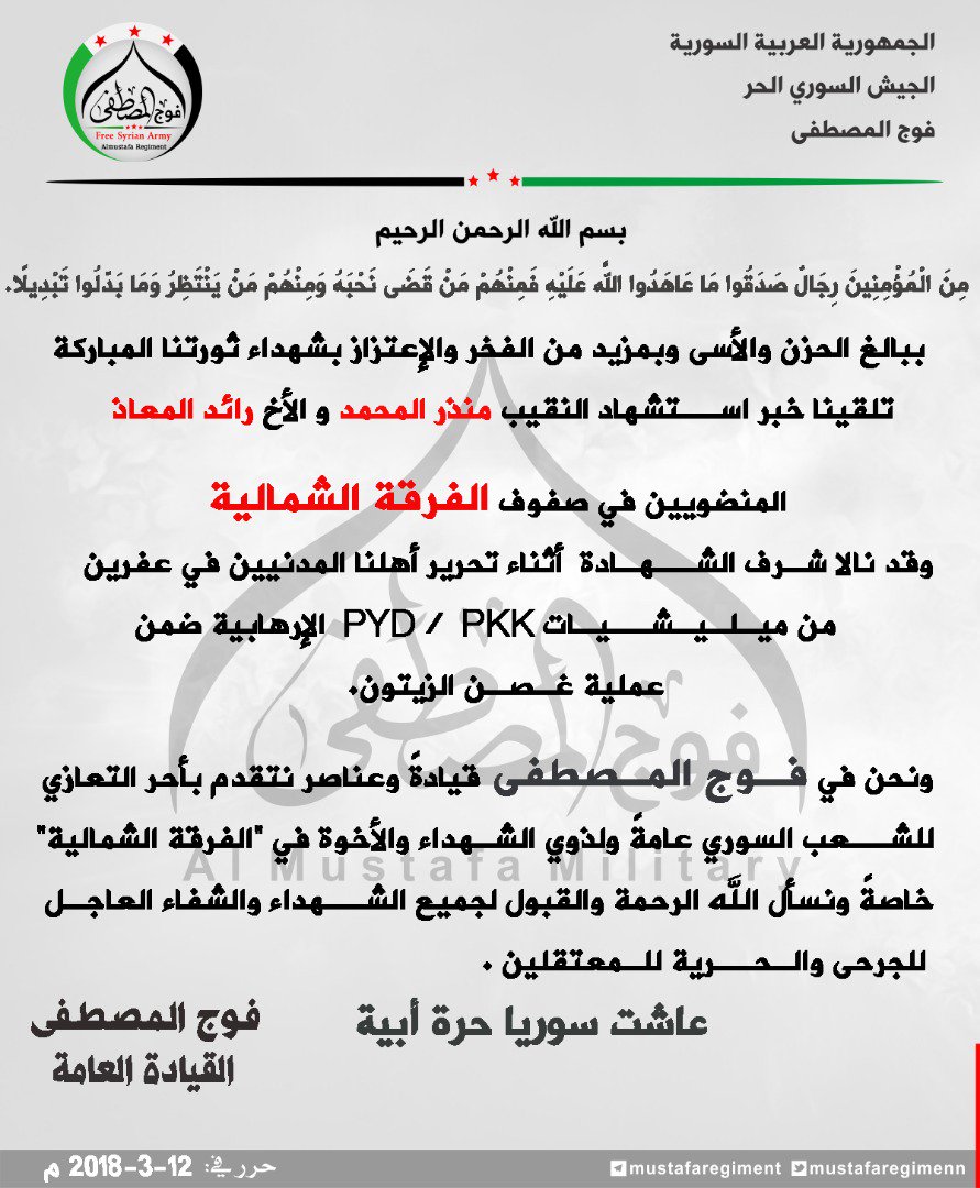 بيان من فوج المصطفى يعزي فيه الفرقة الشمالية بالنقيب منذر المحمد في عملية غصن الزيتون ضد القوات الكردية