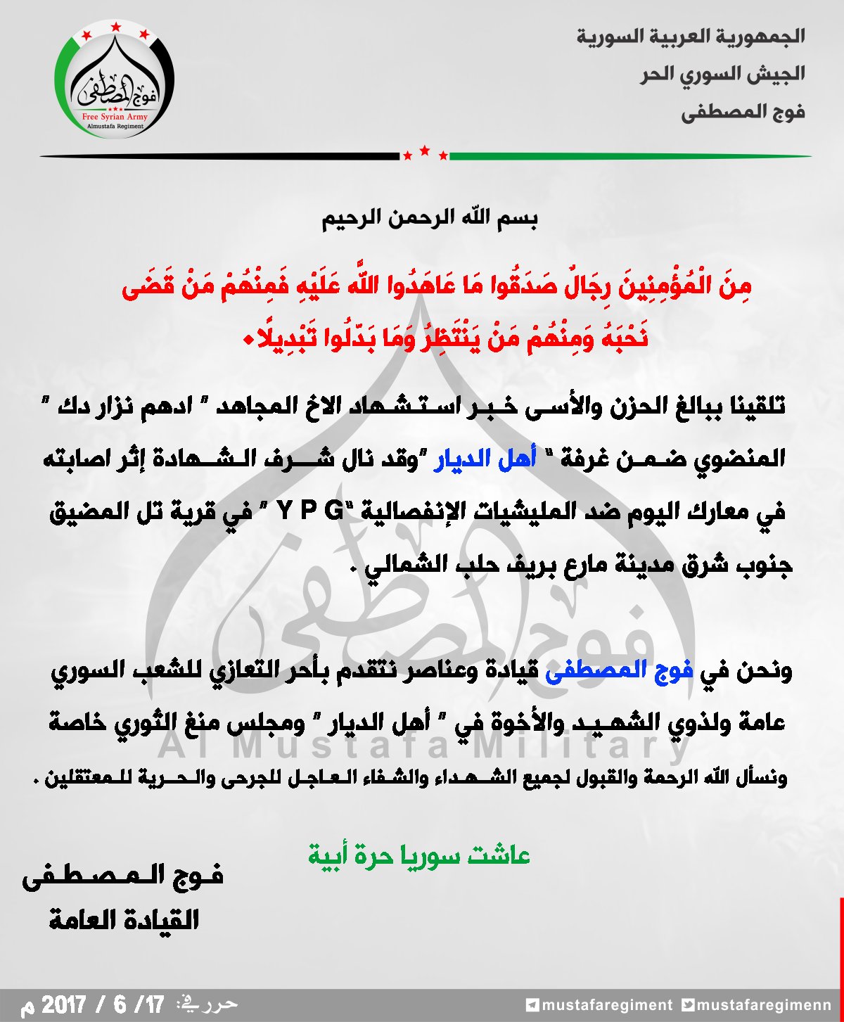 بيان من فوج المصطفى يعزي فيه غرفة عمليات أهل الديار بأحد عناصرها في معارك ضد قوات قسد