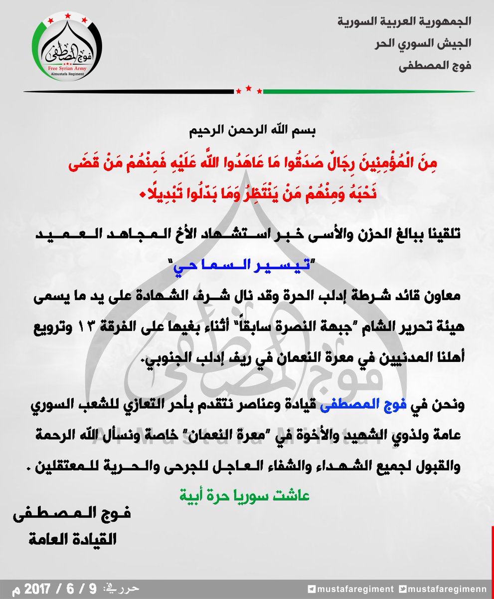 بيان من فوج المصطفى يعزي بمقتل العميد تيسير السماحي على يد هيئة تحرير الشام