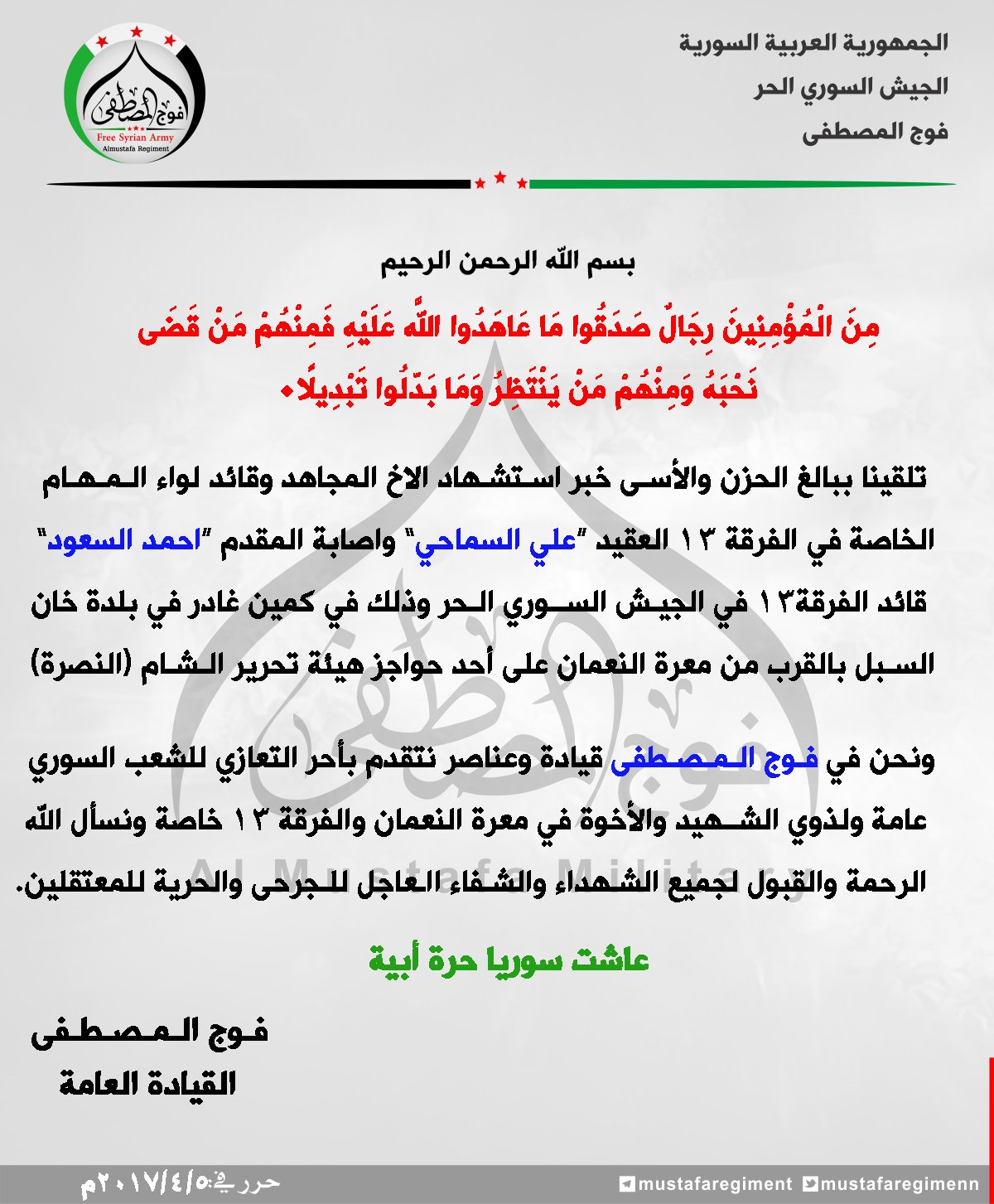 بيان من فوج المصطفى يعزي فيه بالعقيد علي السماحي وإصابة المقدم أحمد السعود على يد عناصر هيئة تحرير الشام