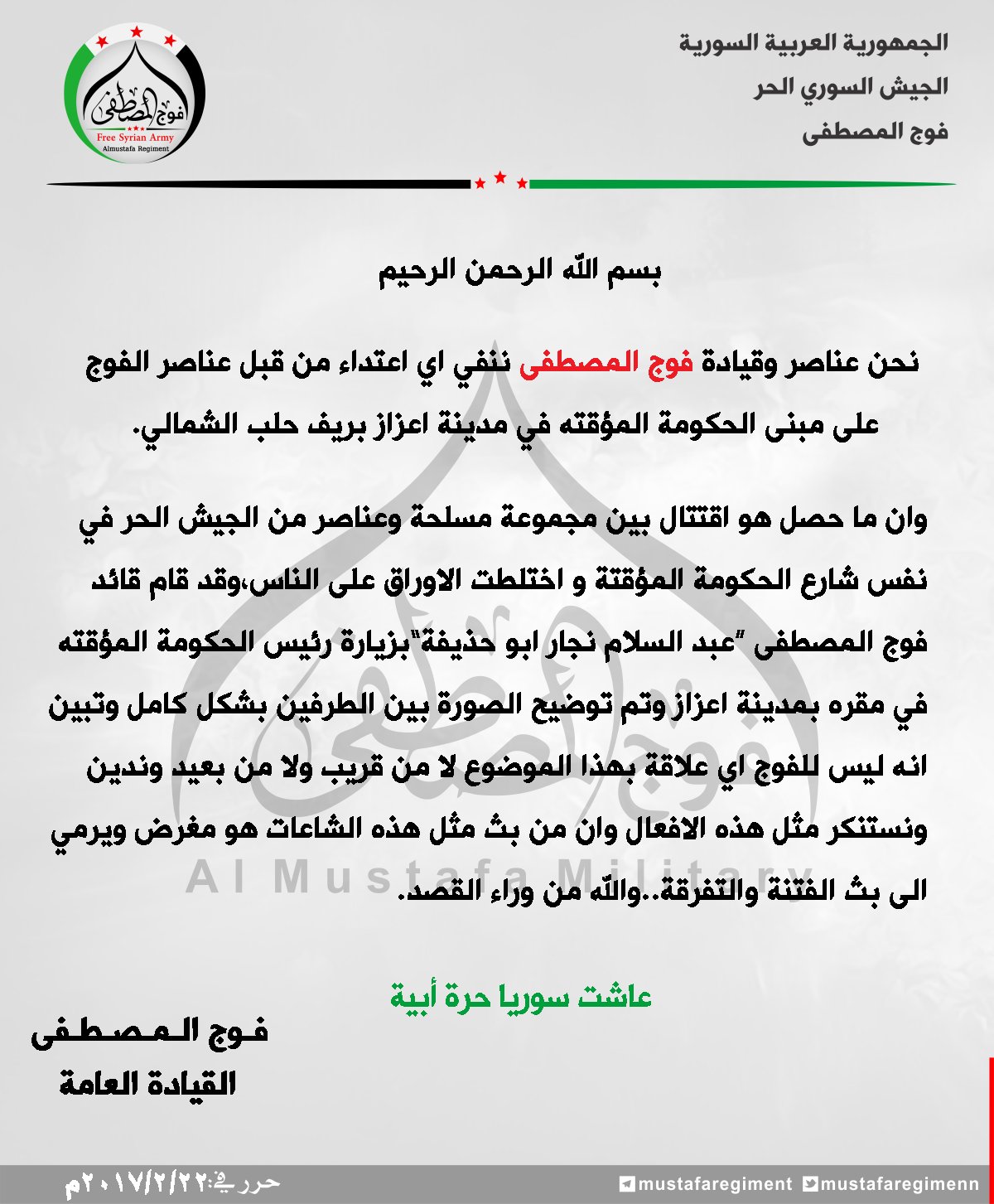 بيان من فوج المصطفى ينفي فيه قيام عناصره بإطلاق النار على مقر الحكومة المؤقتة في اعزاز