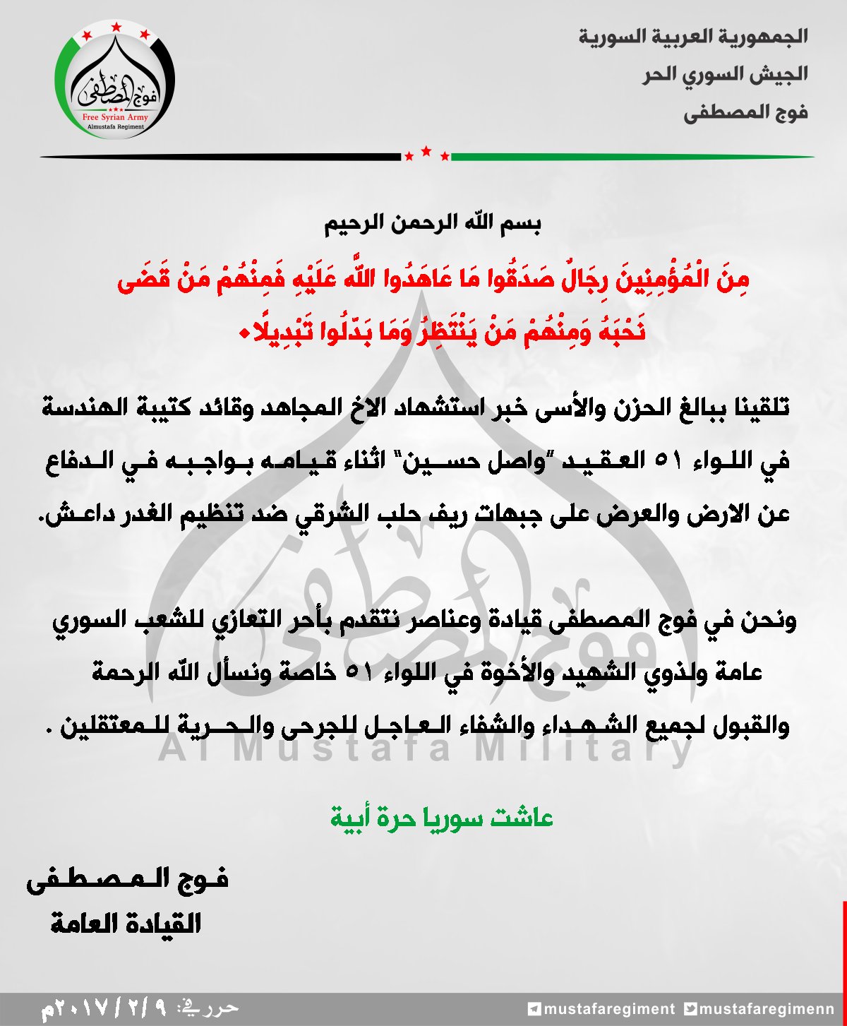 بيان من فوج المصطفى يعزي فيه اللواء 51 بالقائد العسكري العقيد واصل حسين