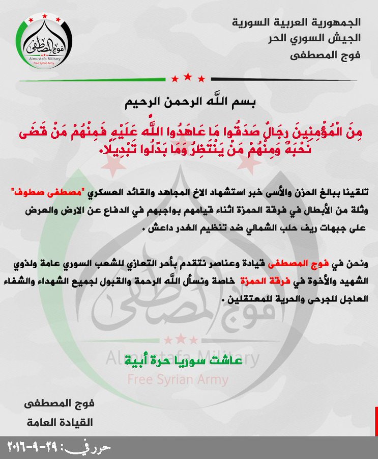 بيان من فوج المصطفى يعزي فيه فرقة الحمزة بالقائد العسكري مصطفى صطوف وعدد من عناصر الفرقة