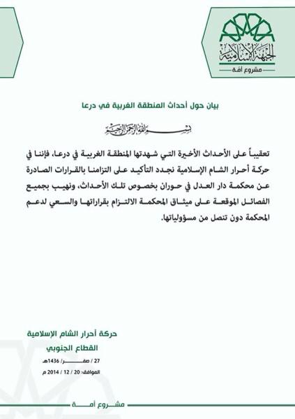 بيان من حركة أحرار الشام قطاع درعا تعقيباً على أحداث المنطقة الغربية في درعا