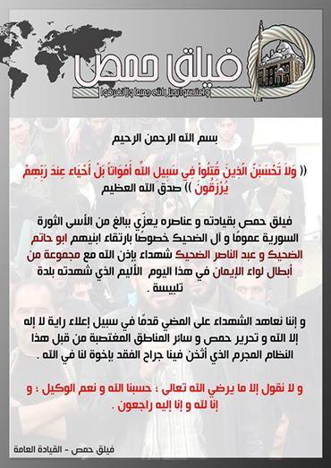 بيان من فيلق حمص يعزي فيه بأبو حاتم الضحيك وعبد الناصر الضحيك