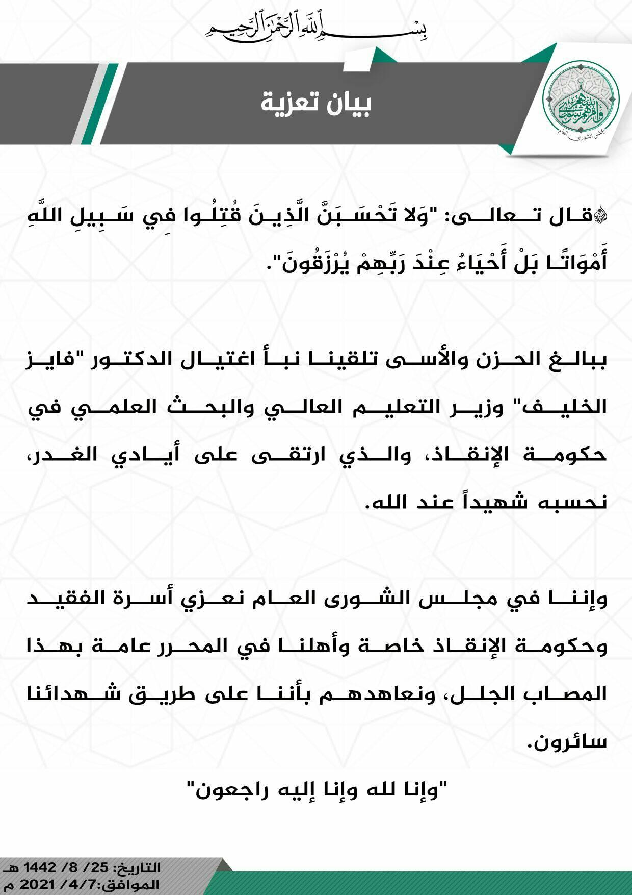بيان من مجلس الشورى العام يعزي فيه بوزير التعليم العالي والبحث العلمي في حكومة الإنقاذ السورية الدكتور "فايز الخليف"