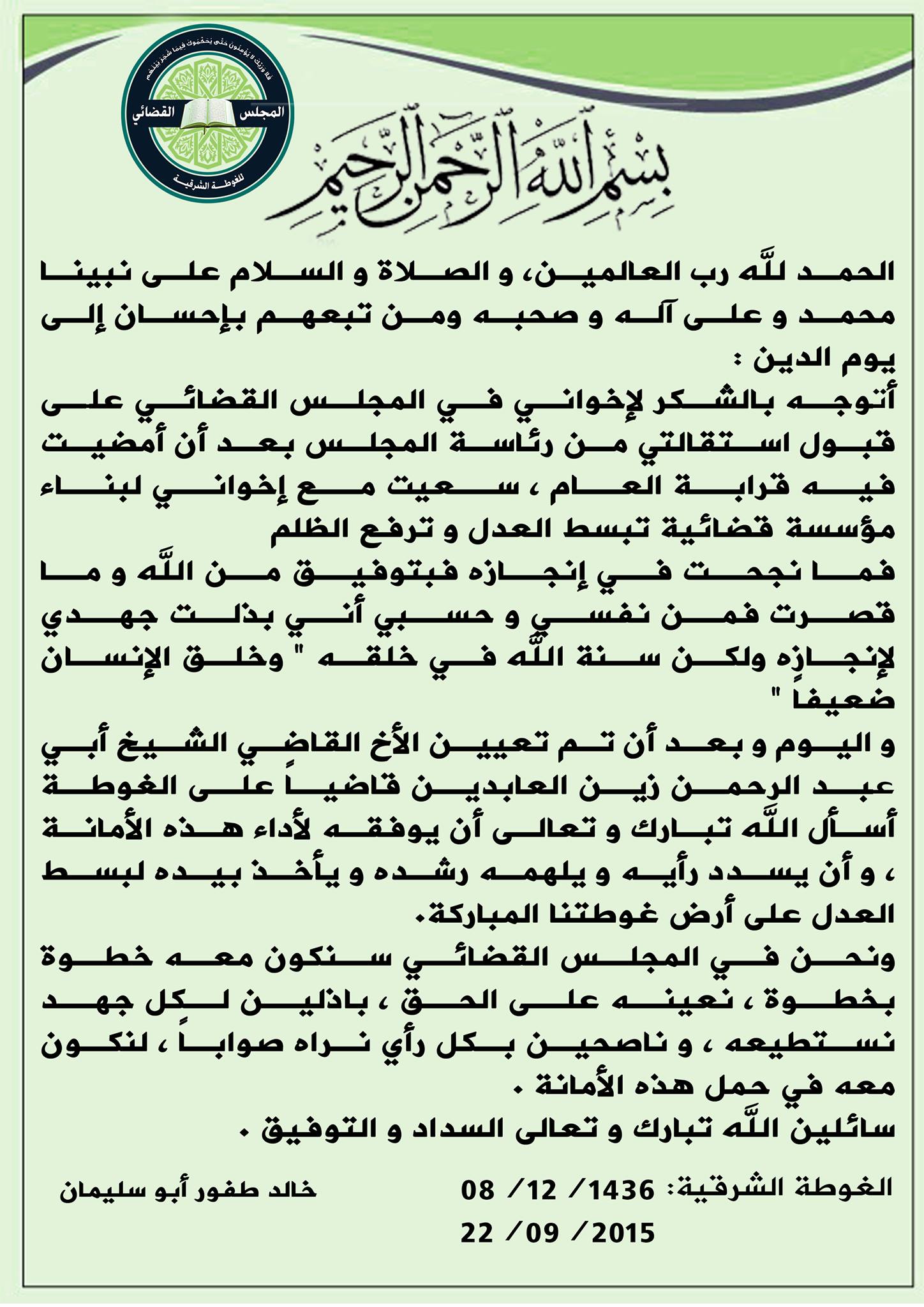 بيان استقالة خالد طفور من المجلس القضائي الموحد في الغوطة الشرقية