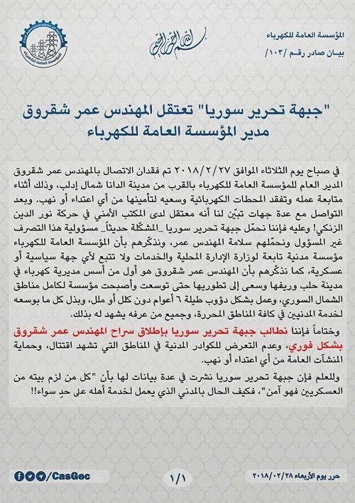 جبهة تحرير سوريا تعتقل المهندس عمر شقروق مدير المؤسسة العامة للكهرباء