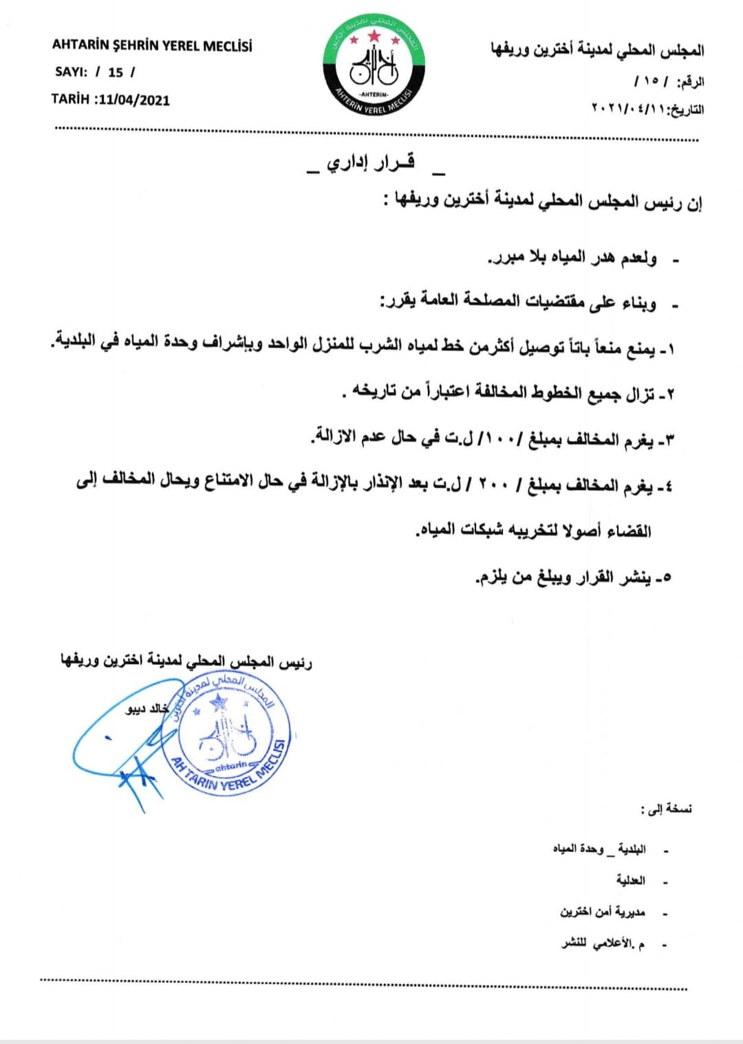 تعميم من المجلس المحلي لمدينة أخترين بمنع توصيل أكثر من خط مياه شرب واحد للمنزل تحت طائلة المخالفة