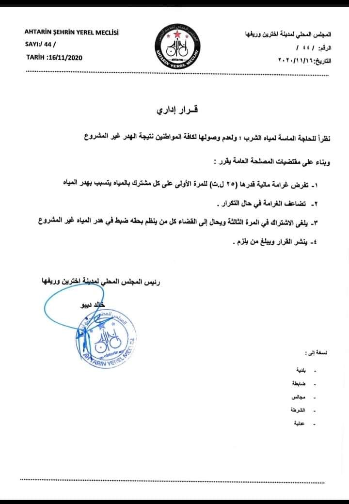 قرار من المجلس المحلي لمدينة أخترين بفرض غرامة مالية على كل مشترك يتسبب بهدر المياه