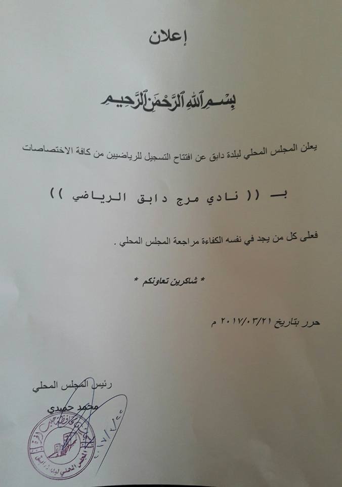 إعلان من المجلس المحلي لبلدة دابق يعلن عن افتتاح التسجيل للرياضيين من كافة الاختصاصات في نادي مرج دابق الرياضي