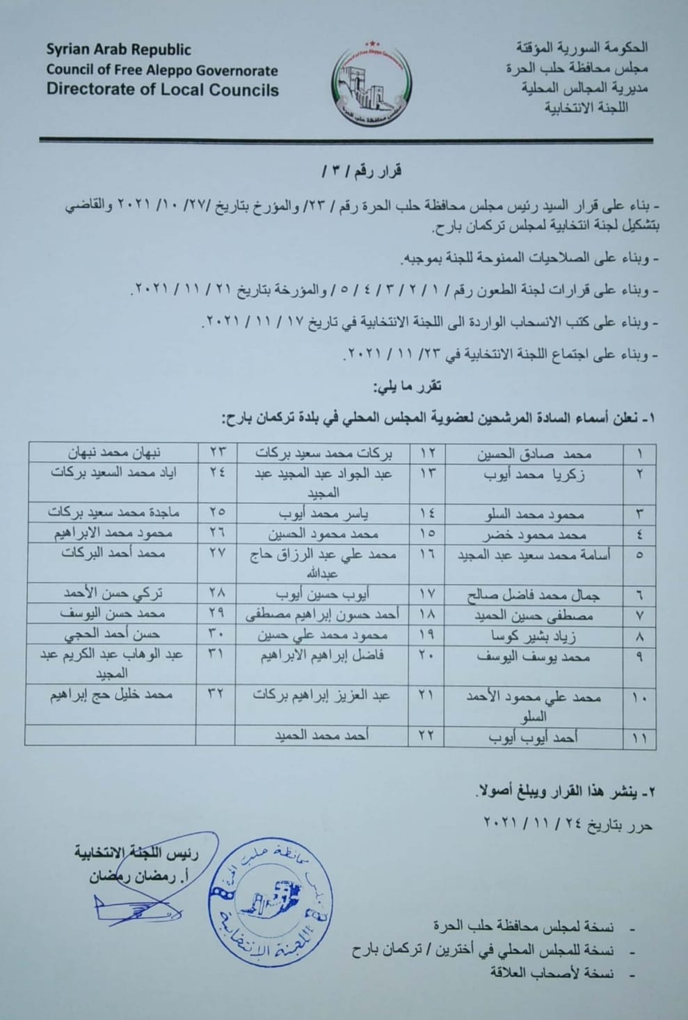 قرار من مجلس محافظة حلب الحرة بخصوص أسماء المرشحين لانتخابات المجلس المحلي في تركمان بارح