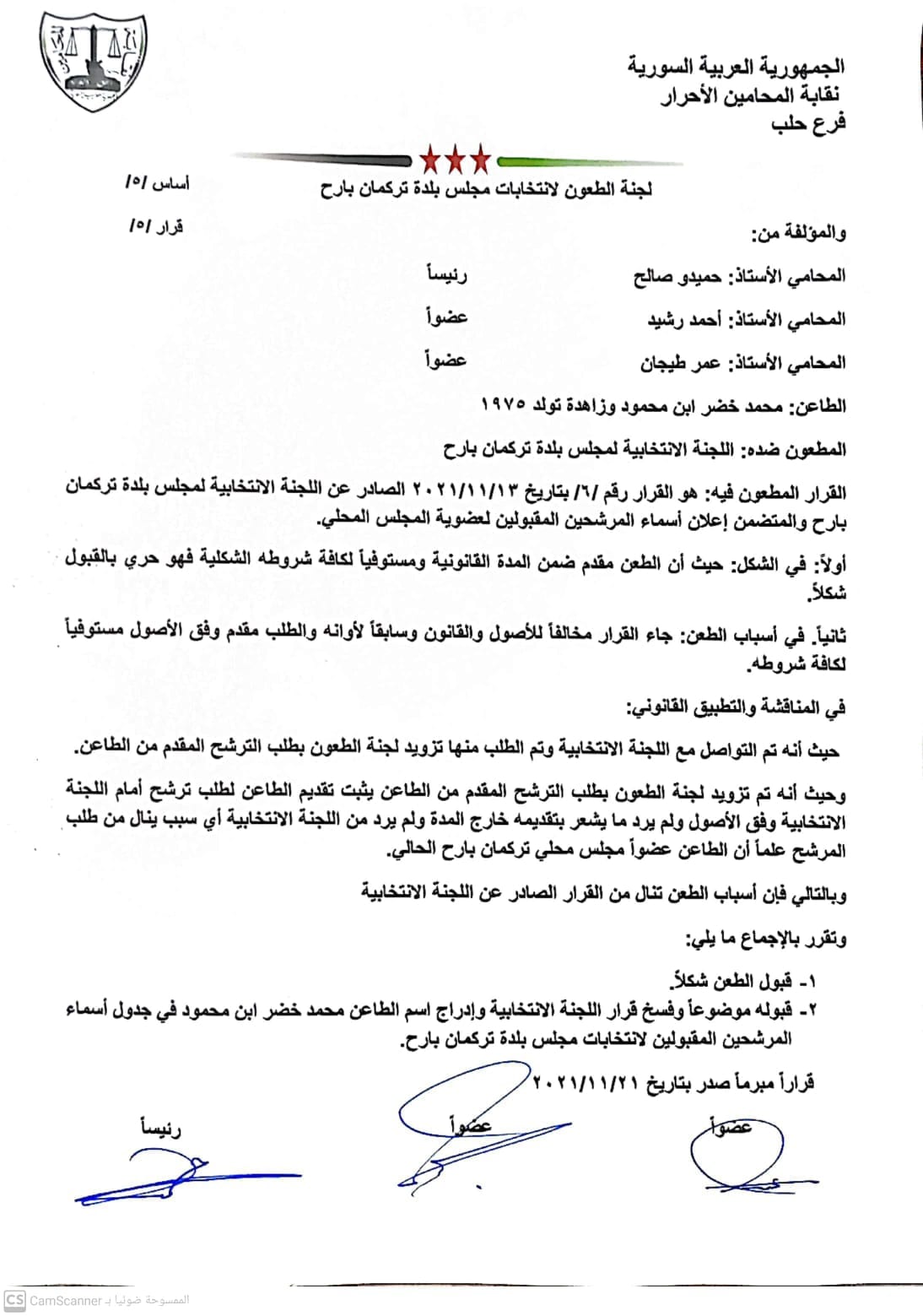 قرار من لجنة طعون لانتخابات المجلس المحلي لبلدة تركمان بارح بقبول طلب الطعن بانتخابات المجلس
