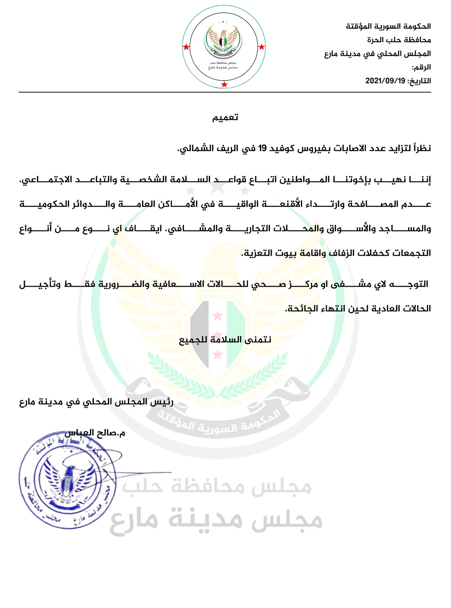 تعميم من المجلس المحلي في مدينة مارع يطلب فيه من المواطنين قواعد السلامة الشخصية والتباعد الاجتماعي عدم المصافحة منعاُ لانتشار كورونا